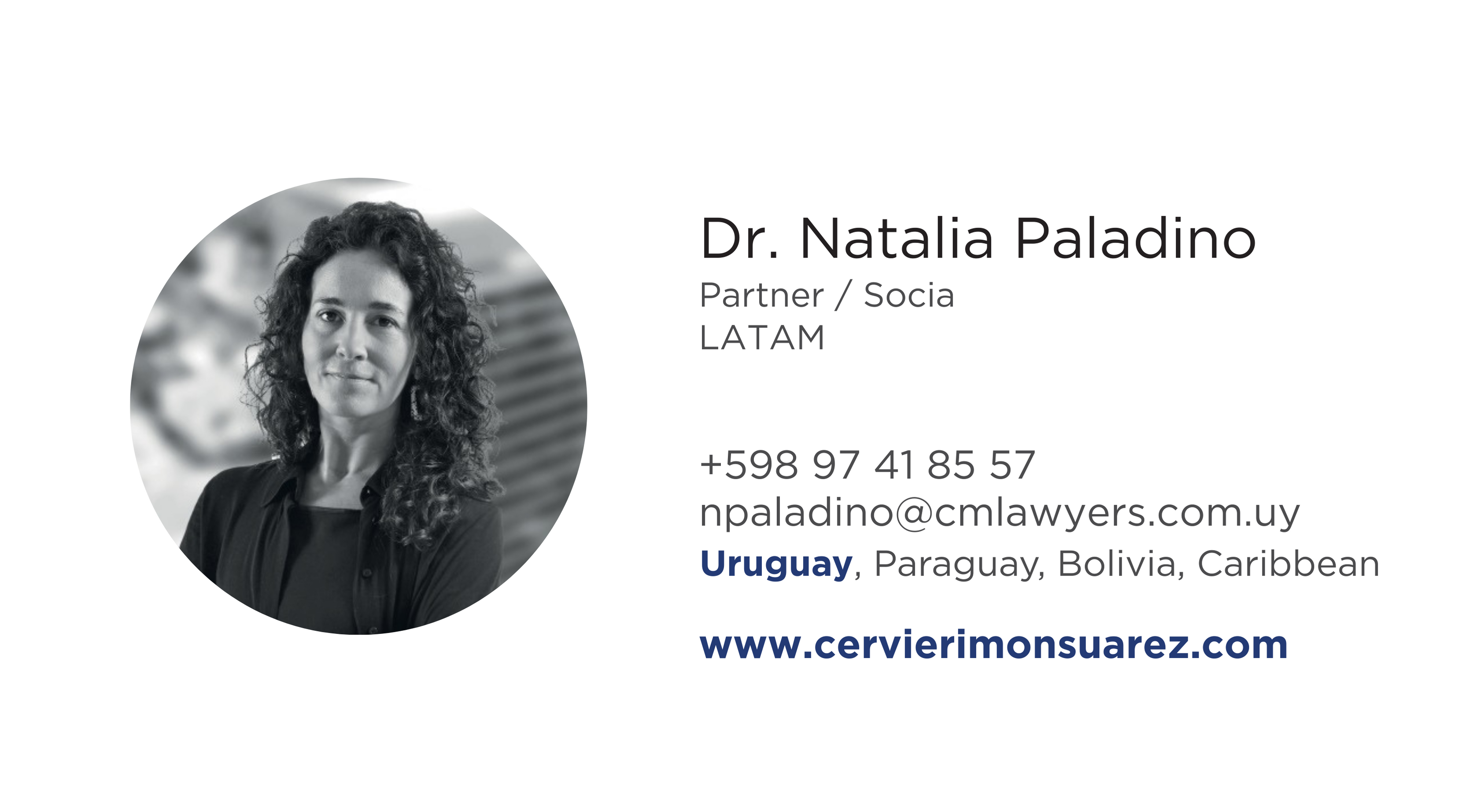 Doctora en Derecho y Ciencias Sociales, Universidad de la República, Uruguay (2004). Posgrado en Propiedad Intelectual. Agente de la Propiedad Industrial (2005). Miembro de la AUDAPI (Asociación Uruguaya de Agentes de la Propiedad Industrial), INTA (International Trademark Association), ASIPI (Asociación Interamericana de la Propiedad Intelectual), AIPPI (Asociación Internacional para la protección de la Propiedad Intelectual), ASPI (Asociación Paulista de Propiedad Intelectual), ABPI (Associação Brasileira da Propriedade Intelectual). Delegada Nacional de ASIPI (Asociación Interamericana de la Propiedad Intelectual) para Uruguay y miembro del Comité de Diversidad, Inclusión y Sostenibilidad, período 2021 2023. Miembro del programa ASIPI Pro-Bono. AIPPI: Miembro de grupo nacional de Uruguay para AIPPI. INTA: Miembro del Comité de indicaciones geográficas, período 2021-2023. Dictó diversos cursos relativos a PI en la Cámara de Industrias del Uruguay, en Escuelas de Diseño y en Centros Comerciales del Uruguay. Participó como expositora en diversos seminarios relativos a la protección y defensa de la Propiedad Intelectual: Seminario Internacional: “Nuevos Desafíos” en Hotel Cottage, Montevideo, Uruguay- Cervieri Monsuárez & Asociados (2019); ASIPI Montevideo (2020); “Indicaciones Geográficas y Denominaciones de Origen en la Comunidad Andina: Desafíos y Oportunidades”, IPKey; Webinar “Diversidad, inclusión y sostenibilidad, la importancia de integrar estos conceptos en el entorno legal. Las firmas que lo han logrado comparten sus experiencias” ASIPI (2022); Seminario Internacional “Innovación y actualidad en la defensa de la Propiedad Intelectual” en Antel Arena, Montevideo, Uruguay – Cervieri Monsuarez y CALPYC (2022). Idiomas: Español, Inglés, Italiano y Portugués.